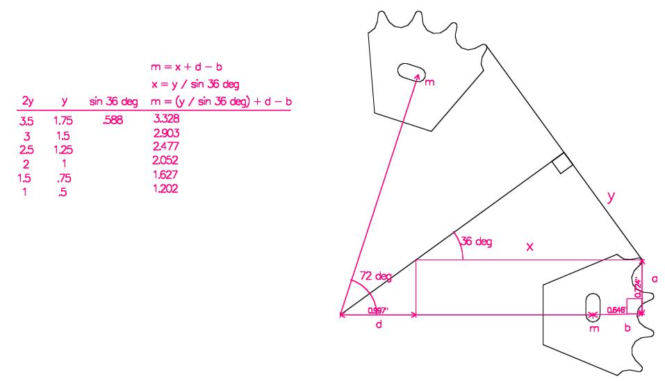 To solve this problem, I had to reach back into my memory and dust off my limited knowledge of high school trigonometry. Thanks to the beauty, symmetry and order of geometry in general, right triangles in particular, and that old mnemonic SOH CAH TOA (sine=opposite/hypotenuse, cosine=adjacent/hypotenuse, and tangent=opposite/adjacent) I was able to identify the proper locking positions of the gear segments on radial arms as 72 degree angles from each other (since there are five in the 360 degree circle). The illustration below shows the calculations I made after some struggles to remember basic algebra and trig.